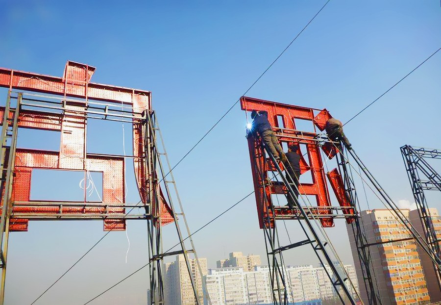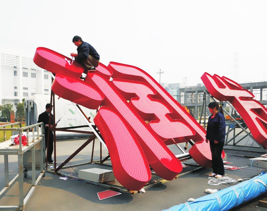 外露發(fā)光字由兩部分組成:一個(gè)金屬?zèng)_孔字,另一個(gè)是LED光源。發(fā)光字是由打好孔的字殼,和單色外漏燈組成。把整張的板材在機(jī)床上沖孔,再根據(jù)字形切割出來,焊好立體邊,打磨,烤漆處理,再把LED燈裝在沖好的孔上。 字形切割采用高精度等離子切割,立體邊使用專業(yè)的勾槽機(jī)勾角處理,并采用優(yōu)質(zhì)汽車漆烤制而成。